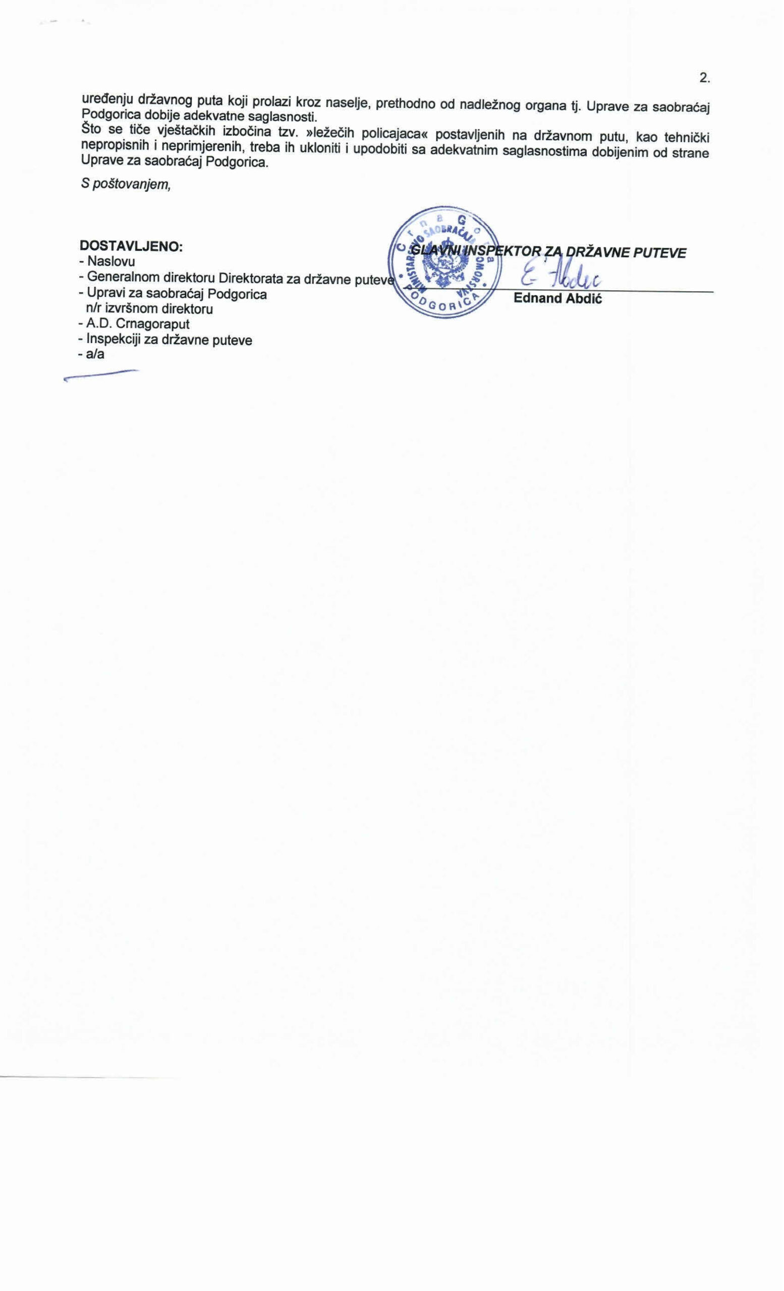 Veliki broj ležećih policijaca nije uradjen u skladu sa Zakonom a što jasno i nedvosmisleno pokazuje nalaz glavnog inspektora za državne puteve Ednanda Abdića od 16.08. tekuće godine.