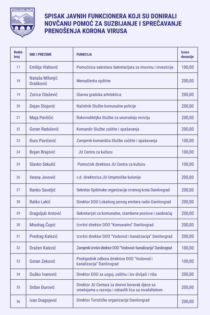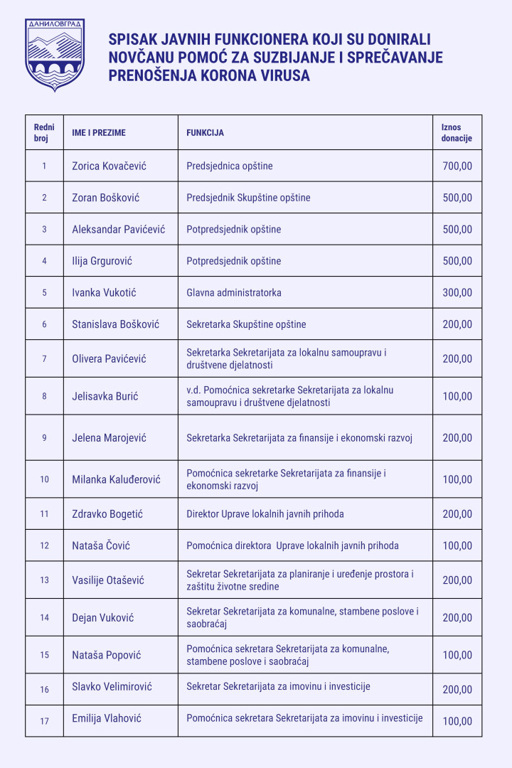 Društvo Opština donirala 10 000, funkcioneri lokalne samouprave 7 700 eura By Redakcija 20 03 2020 18:120 PodijeliTweet 0 Opština Danilovgrad donirala je 10 000€ dok su funkcioneri lokalne samouprave donirali iznos 7700€. Kako su saopštili iz opštine Danilovgrad sredstva su donirana Nacionalnom koordinacionom tijelu za zarazne bolesti.