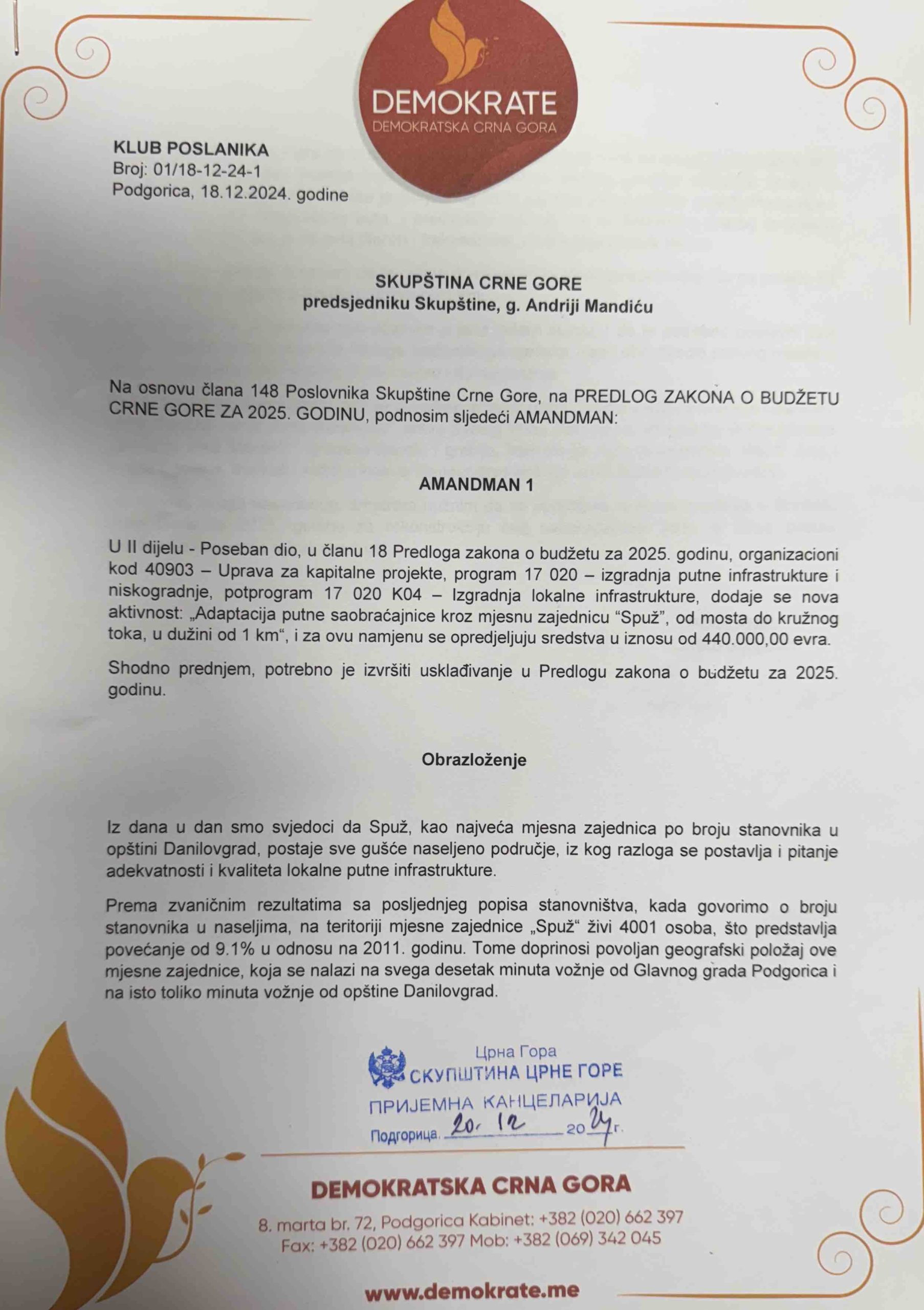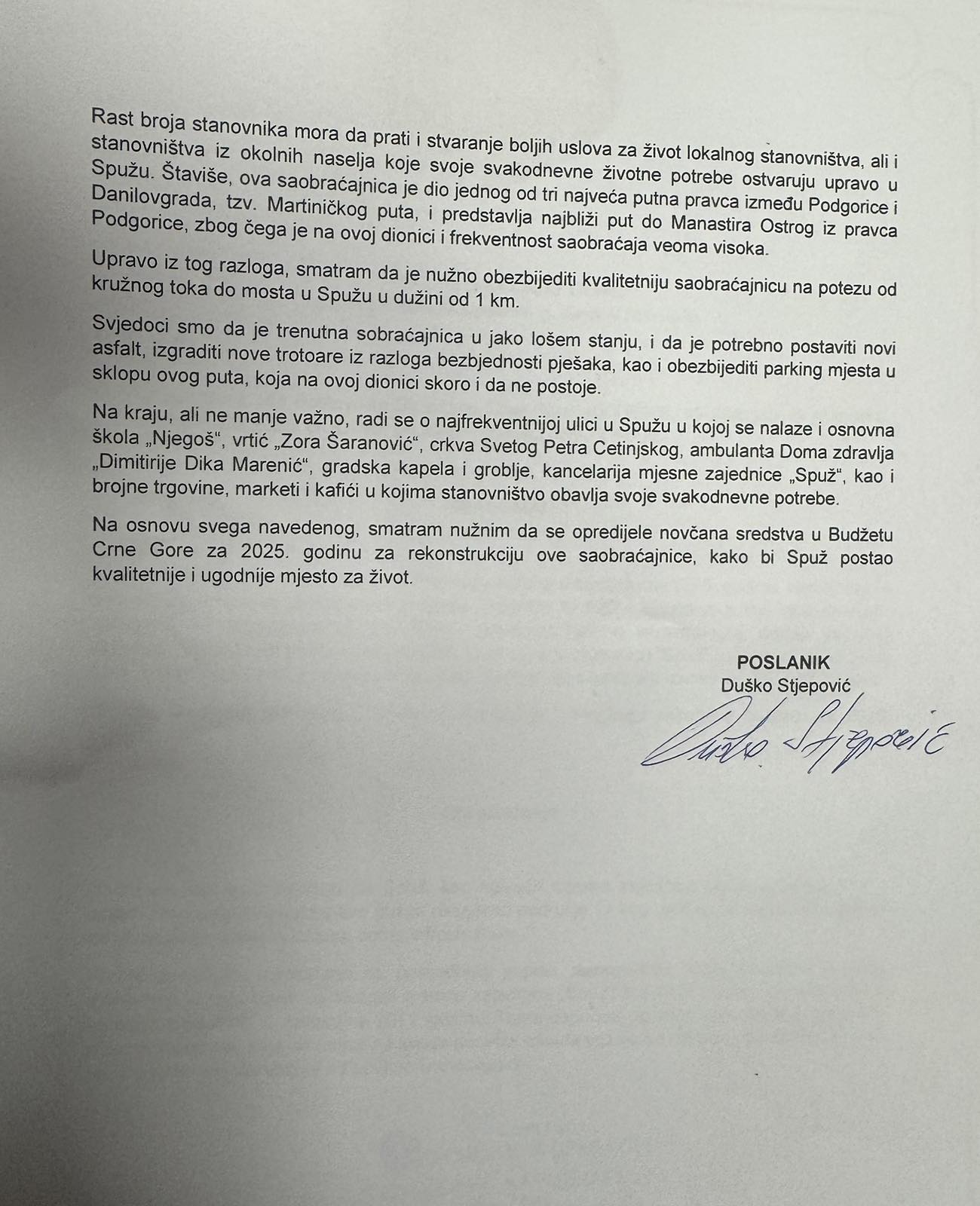 Poslanik u Skupštini Crne Gore i odbornik Demokrata u Skupštini opštine Danilovgrad, Duško Stjepović, predao je amandman na Predlog zakona o budžetu za 2025. godinu kojim se traži izdvajanje 440.000 evra za adaptaciju ključne saobraćajnice kroz mjesnu zajednicu Spuž.
