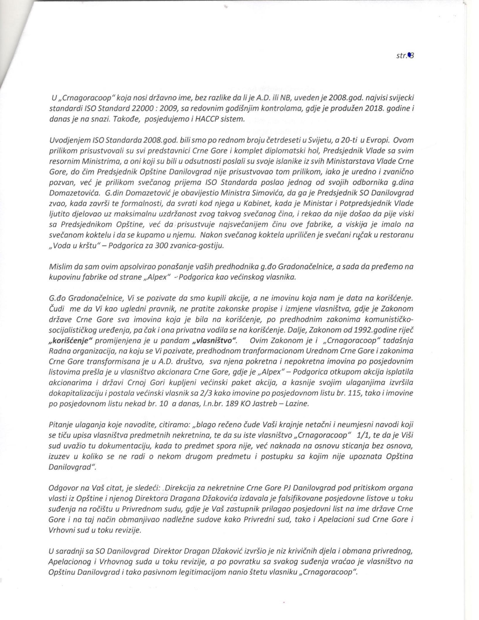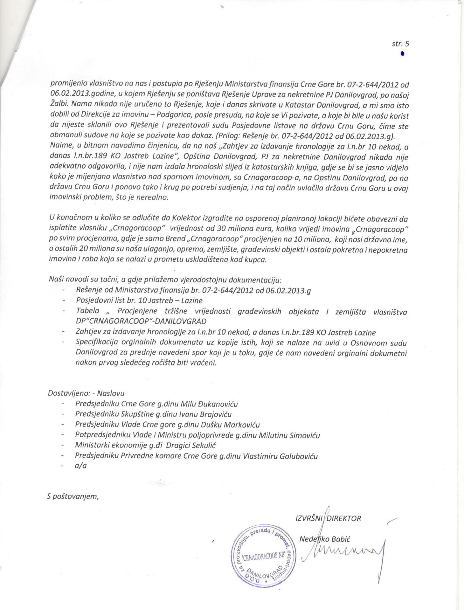 Reagovanje je pored predsjednice Opštine bilo dostavljeno i ostalim relevantnim adresama na državnom nivou: Predsjednicima države, parlamenta i skupštine kao i ministarstvima ekonomije, poljoprivrede i ruralnog razvoja kao i drugim relevantnim adresama.