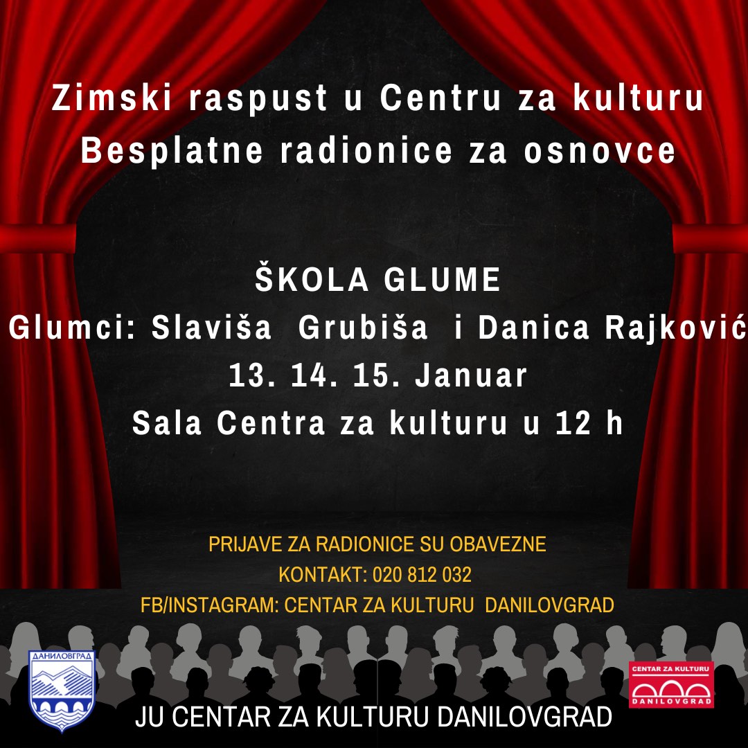 Centar za kulturu Danilovgrad objavio je pozive za učešće na radionicama koje će se održati u mjesecu januaru. Kako su naveli iz Centra za kulturu u okviru programa Centra biće organizovane besplatne radionice glume koje će voditi glumci Slaviša Grubiša i Danica Rajković.